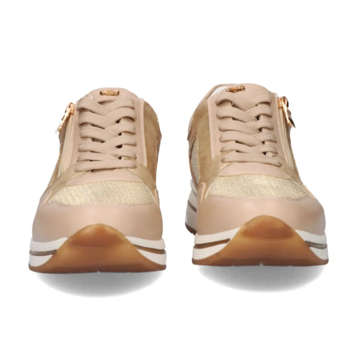 Tenis Em Tons Dourados E Bege Com Fecho De Atacador E Detalhe De Ziper Lateral. Composto Por Sola Sintetica E Gaspea E S…
